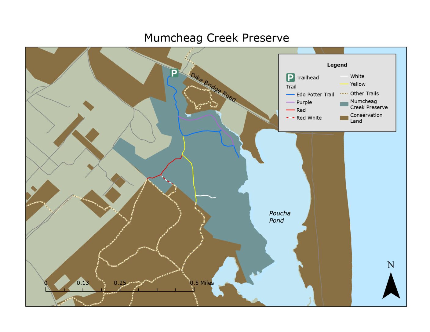 There is a 4-car trailhead located off Dike Bridge Road, approximately 1/4 mile down the road on the right. The trail can also be accessed via the Land Bank’s Poucha Pond Reservation.